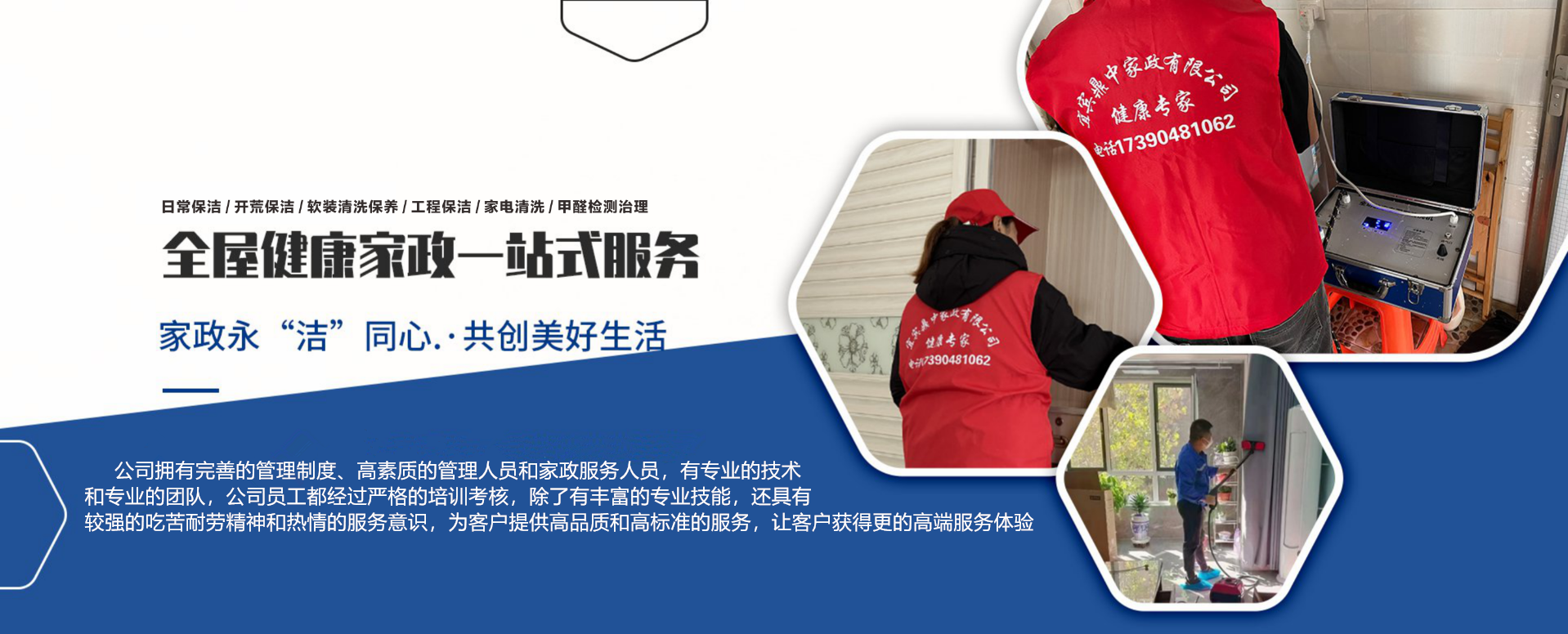 宜賓鼎中家政有限公司,是一家提供家庭健康一站式服務的新型家政公司,本公司提供,日常保潔,開荒保潔,甲醛檢測和治理,家電清洗,軟裝清洗,拋光打蠟,各種養護,工程服務,大型油煙機清洗和中央空調清洗等服務。        我公司起源于2012年,從當時單打獨斗的游擊隊,到現在發展成為一家為家庭提供一站式服務的新型家政公司,有專業的技術工程師和各項服務的專業團隊,服務過無數家庭和事業單位,比如理工大學、宜賓學院開荒保潔,宜賓商業銀行保潔等。        公司擁有完善的管理制度、高素質的管理人員和家政服務人員,有專業的技術和專業的團隊,公司員工都經過嚴格的培訓考核,除了有豐富的專業技能,還具有較強的吃苦耐勞精神和熱情的服務意識,為客戶提供高品質和高標準的服務,讓客戶獲得更******的高端服務體驗。        誠信為本,品質至上,服務于千家萬戶        宜賓鼎中家政有限公司--------竭誠為您服務 聯系人:楊總 電話:17390481062(微信同號) 地址:四川省宜賓市敘州區朱家坡路1號緹香灣